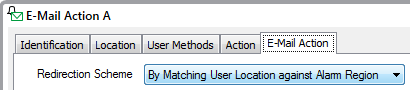 On the E-Mail Action tab of the E-Mail Action's configuration Form, the Redirection Scheme is specified as 'By Matching User Location against Alarm Region'. With this redirection scheme, when the redirection is triggered, Geo SCADA Expert checks the geographical region within which the alarm is located (it does this by checking the coordinates of the database item with which the alarm is associated, and then uses those coordinates to determine the geographical region within which the database item is located). It also checks the users' coordinates to determine the region(s) within which each user is located. Providing that the other alarm criteria are met, Geo SCADA Expert then redirects the alarm to those users that are in the same region as the database item with which the alarm is associated.