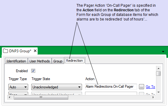 On the Form for each Group of database items for which alarms are to be redirected, the Action field on the Redirection tab is used to specify the On-Call Pager Action as the required redirection action: