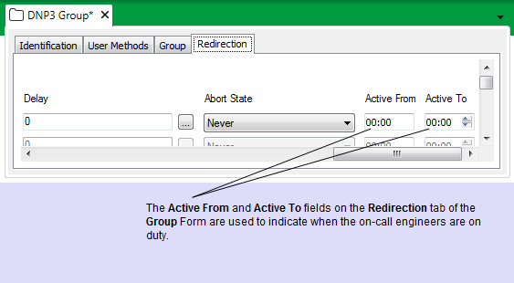 As the on-call engineers are only on duty ‘out of hours’ (in this case, between 18:00hrs and 08:00hrs, when the control room is unmanned), this time period is specified using the Active From and Active To fields on the Form for each Group of database items: