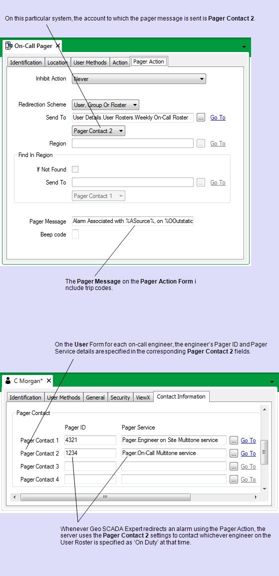 Specify a user’s pager contact details: see Define the E-Mail, Pager, and PIN Login Contact Settings for a User in the Geo SCADA Expert Guide to Security.