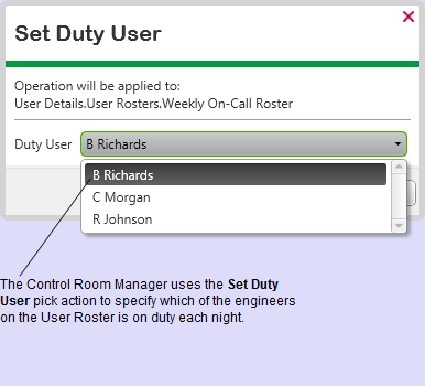 At the end of each working day, the Control Room Manager selects the User Roster’s Set Duty User pick action to specify which of the on-call engineers is on duty that night.