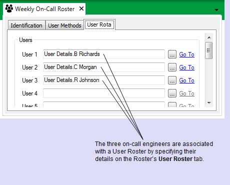 A User Roster is used to redirect alarms ‘out of hours’. The user accounts of the three on-call engineers are referenced from the User Roster: