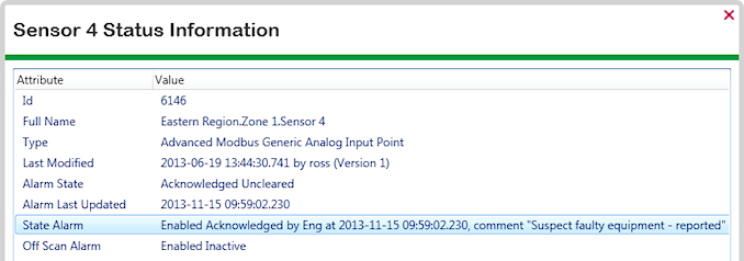 If you usually have access to the Acknowledge with Comment option, but that option is not available, the ability to acknowledge alarms might be restricted to a particular User, User Group, or ViewX workstation. Use the View Status option to view the Status display for the item and ascertain whether such a restriction is in force. For further information, see Set Responsibility Action in the Geo SCADA Expert Guide to Alarm Redirection, and see Standard Alarm States in the Geo SCADA Expert Guide to ViewX and Virtual ViewX Clients.
