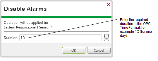 • If a user selects the Disable Alarms action, Geo SCADA Expert prompts the user to define the time period. The user enters the required amount in the OPC Time Format and selects OK.
