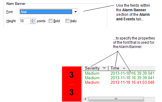- Select the Alarms and Events tab, and then use the Alarm Banner font settings to define the: