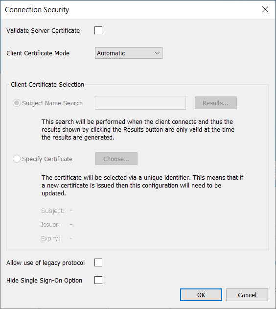 The fields in the Client Certificate Selection section of the window will be 'grayed out' and unavailable for use.
