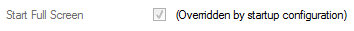 If the DisplayMode attribute is set to "FullScreen" for any of the Window Containers defined in the Startup Configuration File, this will override the Start Full Screen setting on the ViewX Options window (see Miscellaneous Options for ViewX Clients). If this is the case, the Options window will display the following: