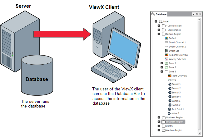 A ViewX client can be configured so that it connects to a single Geo SCADA Expert database. The Geo SCADA Expert database is stored on a Geo SCADA Expert server and it contains the configuration and values for your individual Geo SCADA Expert system.