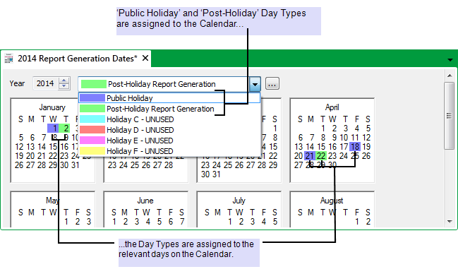 The Calendar is assigned suitable custom Day Types. The Day Types are used to indicate: