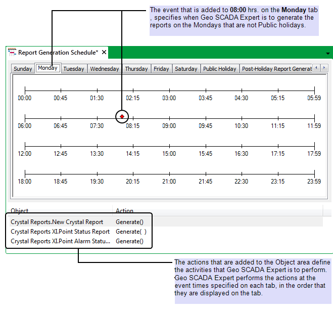 However, on those Mondays (such as 2nd January and 17th April) that are defined as Public Holidays, no reports are generated. Instead, on the dates that immediately follow those days (dates that are specified as ‘Post-Holiday Report Generation’ days), Geo SCADA Expert generates the three area reports at 08:30hrs.