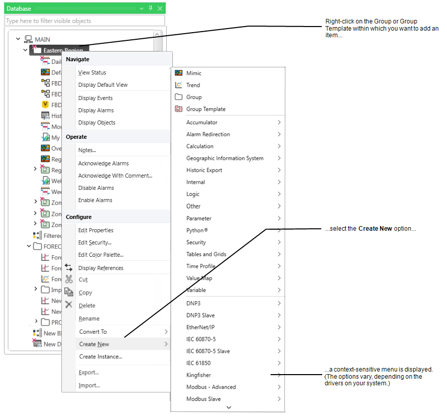 Many items that you add to a Geo SCADA Expert system will be driver-specific (they are only available if a specific driver, such as the DNP3 Driver, is installed). Refer to the relevant driver-specific guide for information on configuring the driver-specific items in your database, including the order in which you should configure the items in your database.