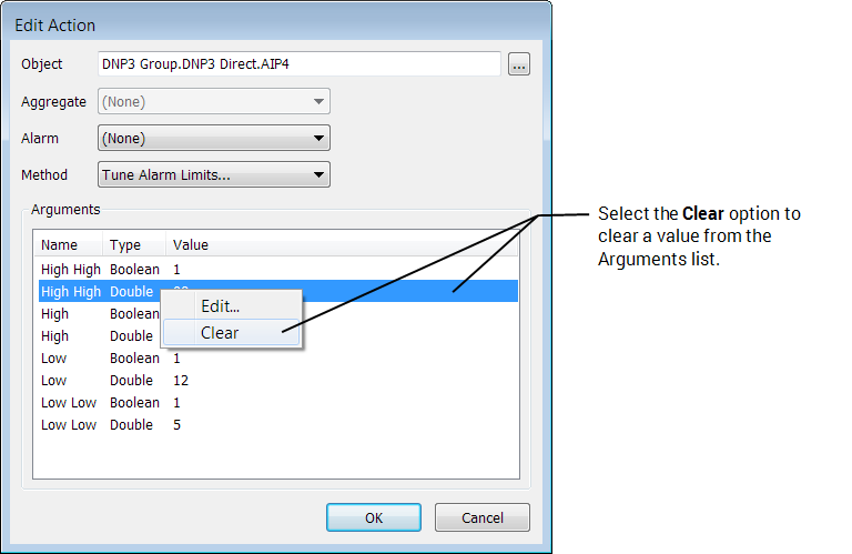 To clear the value that is specified for an argument in the Edit Method window, the Add Action window, or the Edit Action window, either: