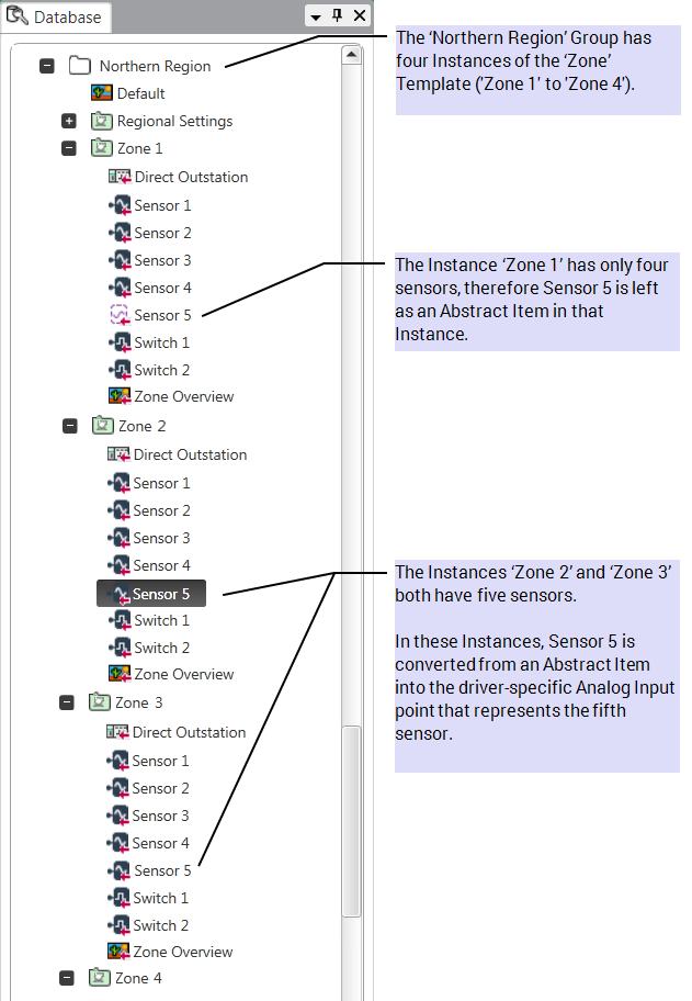 Analog Input points are used in the Group Template to represent sensors that exist in each of the Instances. Many of the Instances have four sensors, but some Instances contain five sensors.