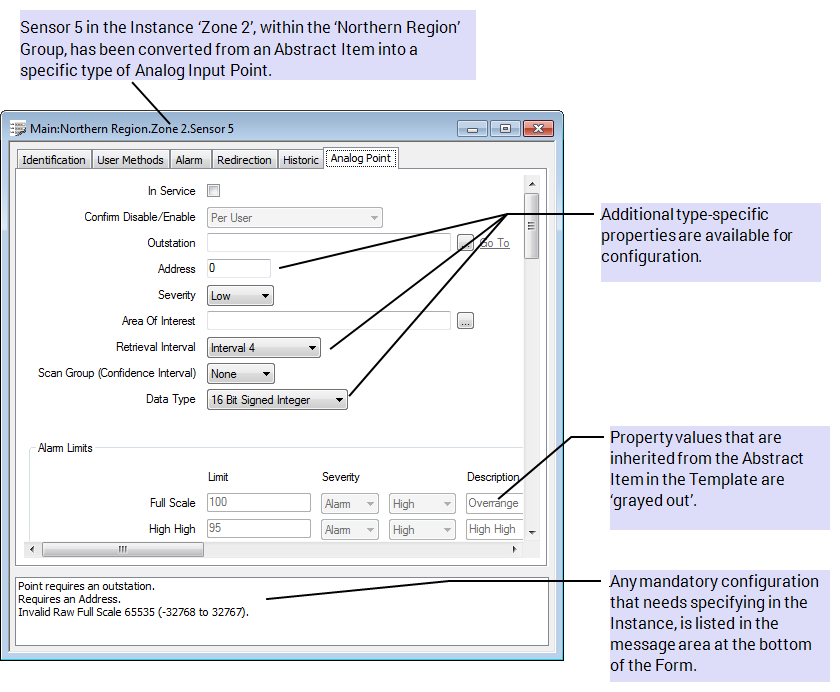 Once an Abstract Item is converted into a specific type of point or outstation, additional properties (and tabs) become available for use on the Form for that item, in the Instances in which it is converted: