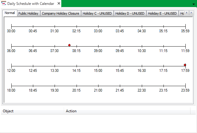 If required, you can associate a Calendar with a Daily Schedule. A Calendar allows you to specify different event times for specific dates in a year, such as company shutdown dates. When a Calendar is associated with a Schedule, six additional tabs are displayed on the Schedule—one for each of the day types that are assigned to the Calendar.