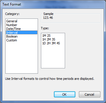 Select the Interval category in the Text Format window when a time period requires a format other than the default of raw seconds. For instance, if you want a time period to display in hours, minutes and seconds.