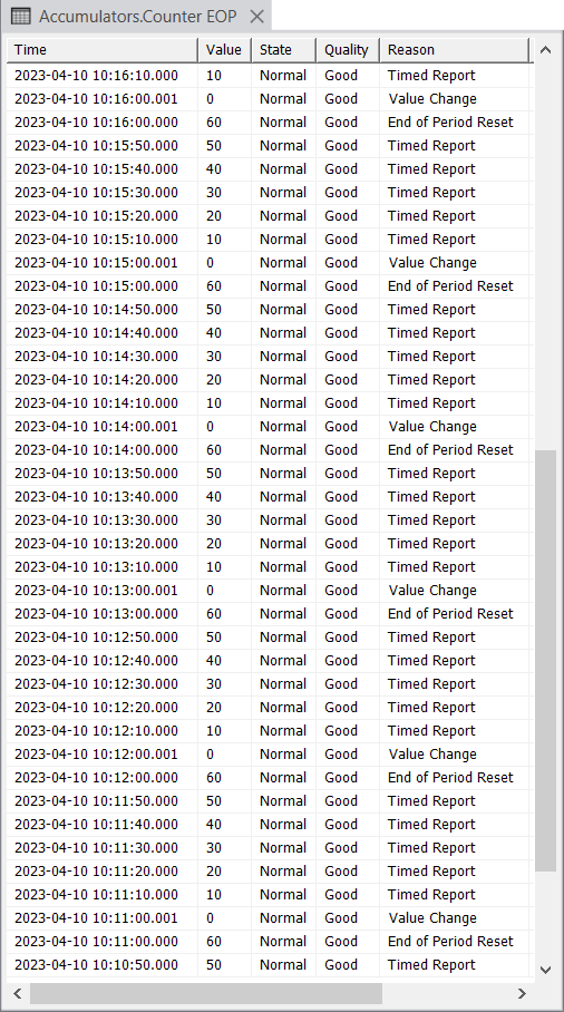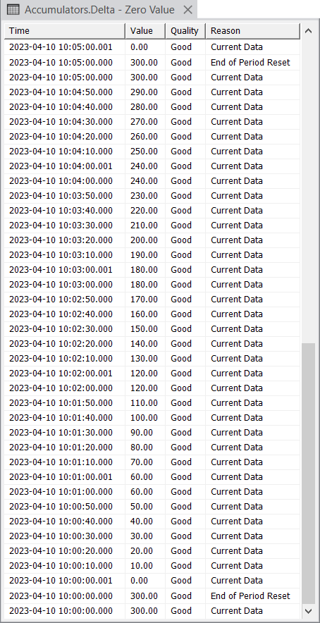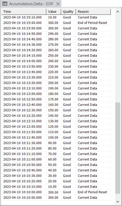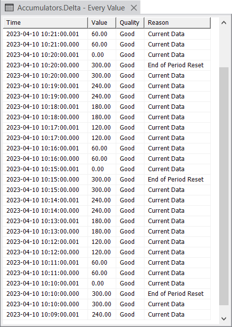 An excerpt from the Historic List for the Delta Accumulator shows how its values change from when its value was reset due to the End of Period reset at 10:10 and then again at 10:15 and 10:20.