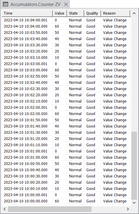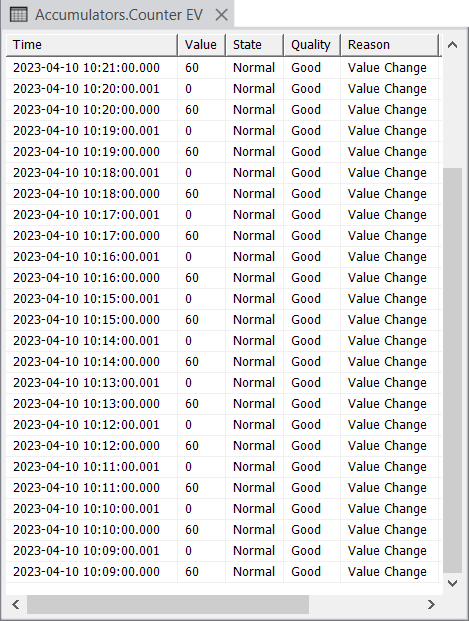 A minute later, at 10:01:00.001 the Counter point's value is initialized back to 0, after which its value starts to increment once again. Notice that the Delta Accumulator's value continues to increment past the time that the Counter point's value gets initialized back to 0 (so the Delta Accumulator's value continues to rise to 70.00, then 80.00, then 90.00, and so on). This is because the Delta Accumulator's Source Reset Type is set to 'Zero Value' and so is configured to ignore any 0 values of its source object.