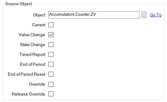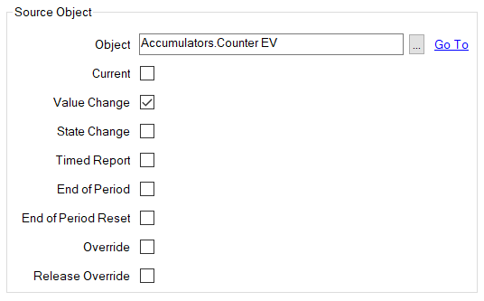 The Delta Accumulator has the Counter point 'Counter EOP' as its Source Object and is configured to take into account the Value Change, Timed Report, and End of Period Reset values of that Source Object: