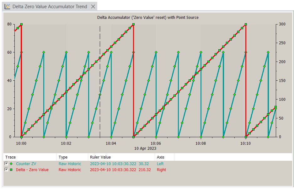 In the Trend shown above, the Counter point source is attached to the left y-axis and the 'Delta - Zero Value' Accumulator trace is attached to the right y-axis.