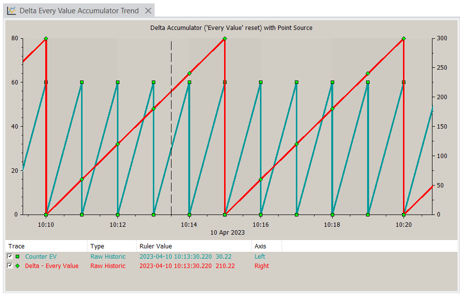 In the Trend shown above, the point source ('Counter EV') is attached to the left y-axis and the 'Delta - Every Value' Accumulator trace is attached to the right y-axis.