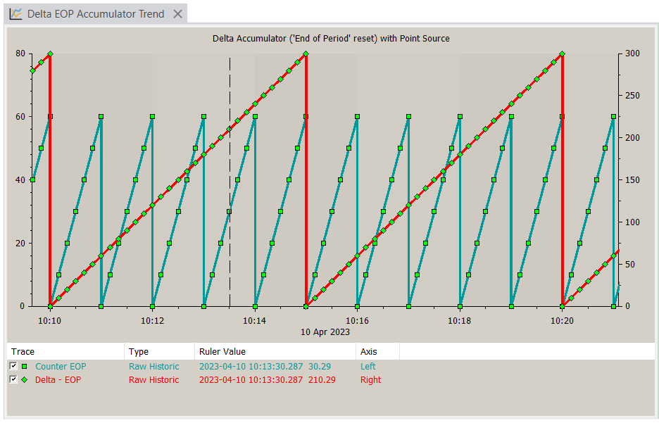 In the Trend shown above, the Counter point source is attached to the left y-axis and the 'Delta - EOP' Accumulator trace is attached to the right y-axis.