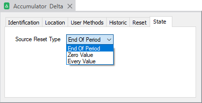 Use the Source Reset Type combo box on the State tab of the Delta Accumulator Form to specify how the Accumulator detects when its source value has reset: