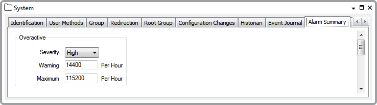 Use the AlarmSummary tab on the Root Group Form to enable or disable and define a warning limit for the number of Alarm Summary records that you expect to create per hour. In addition you can set the maximum number of records stored in a granule. Once a granule reaches the maximum size all further records for the granule are discarded.