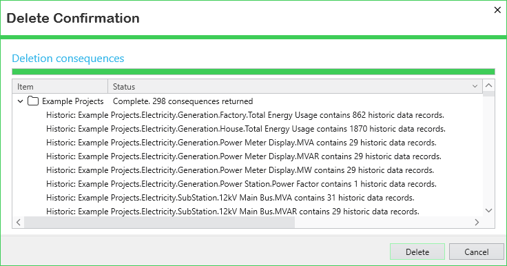You can use the Delete option to remove database items from the Geo SCADA Expert database. This is useful for removing items that you no longer need. You can select to delete multiple database items nested under same Group, but not from different Groups. If you delete a Group, all of the contents from within that Group will also be deleted. You can also opt to delete multiple Groups, providing that those Groups are nested under the same 'parent' Group. Use the CTRL + Enter and/or SHIFT + Enter keys to select multiple items or Groups for deletion.