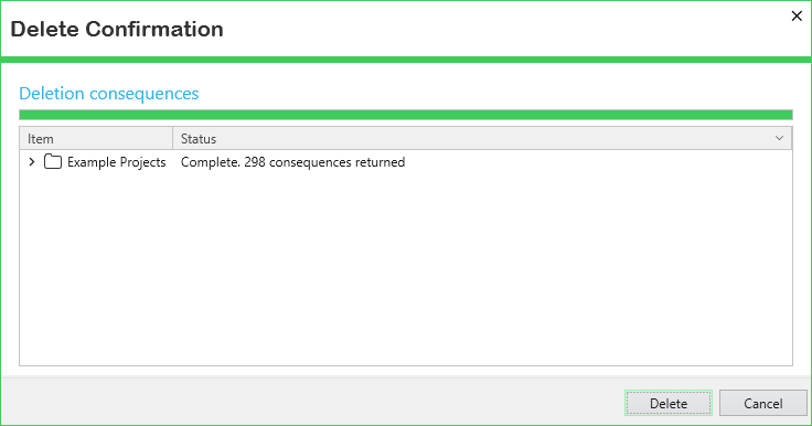 If you select the 'Delete' button while the retrieval of deletion consequences is in progress, then an 'Are you sure' prompt appears. Selecting 'Yes' will result in the items being deleted immediately even though some of the consequences have yet to be retrieved.