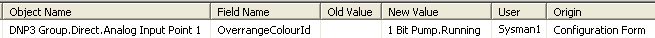 With a property that can be specified using a Combo Box, Geo SCADA Expert stores each property value as a number in the database. For such a property, the Old Value and New Value columns show the number that represents the property’s value. Use the database Schema or the Geo SCADA Expert Server Configuration Tool, as appropriate, to ascertain the value that the number represents (as shown in the second example below).