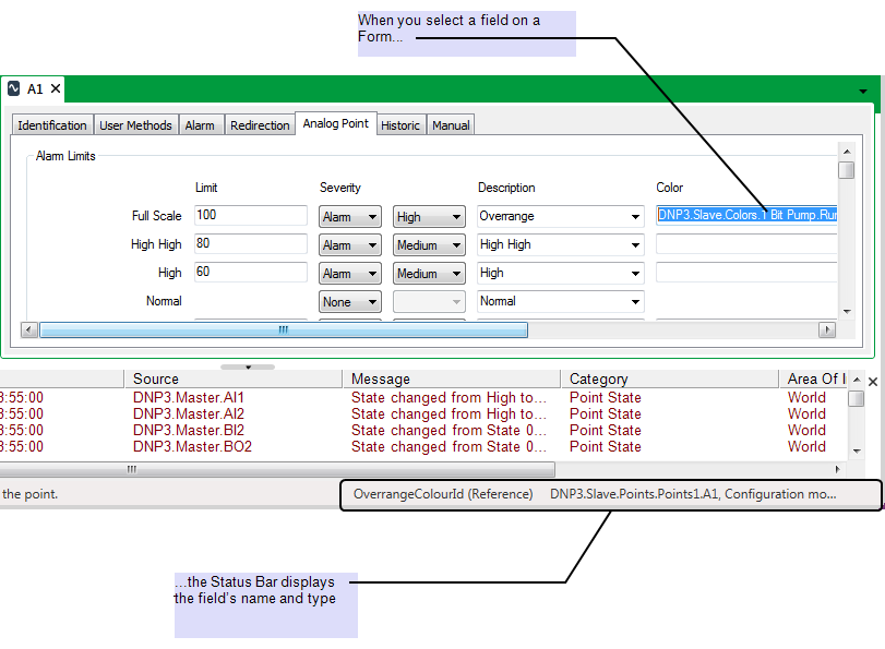 When the Color field is selected on the point’s Form, the name that is assigned to that particular property is displayed in the Status Bar: