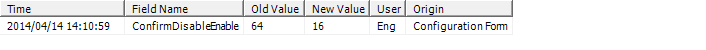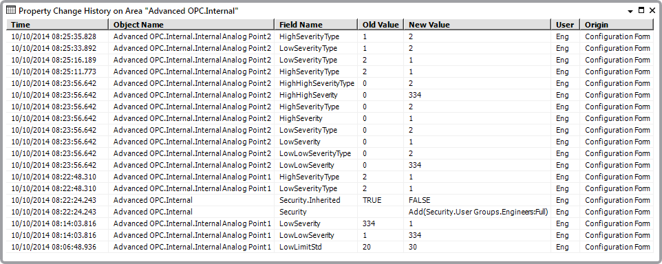 - Origin—The means by which the property’s value was changed. For example, ‘Configuration Form’ if a user changed a value on a Form.