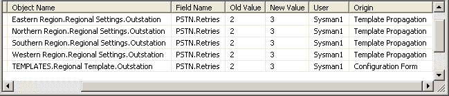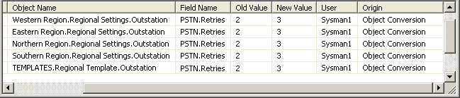 In the Group Template, the engineer converts the Abstract PSTN outstation to a driver-specific type of PSTN outstation. When Geo SCADA Expert converts the outstation from one type to another, any properties that are supported by both types of outstation retain their existing settings. As such, the outstation’s Retries property retains its value of 3. As the Retries property is assigned a value other than the default, this is deemed to be a configuration change and is shown as such in the Property Change History List. In this case, the Origin of the configuration change is shown as Object Conversion: