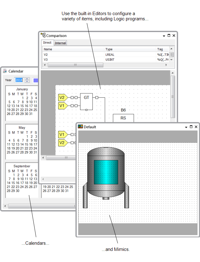 With some types of database item—'file' type objects, such as Logic programs, Mimics, Trends, and Calendars—you use an Editor to configure most of that item’s settings. The Editor provides Design mode access to the item—the mode in which the item's configuration features are active, so that you can edit the item's settings as required (see Design Mode).