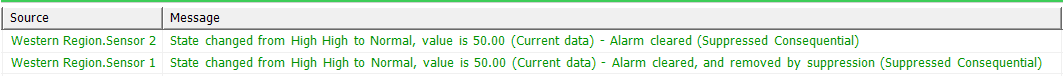 The alarms on 'Sensor 1' and 'Sensor 2' both clear while the suppression remains in force. Different messages are assigned to the entries for the cleared alarms in the Events List. This is due to the fact that suppression is configured to apply differently to existing alarms on the 2 sensors. (The existing alarm for 'Sensor 1' was unaffected by the suppression and so could still be viewed on alarm displays until that alarm cleared, whereas the existing alarm for 'Sensor 2' was hidden from alarm displays once the suppression came into force.)
