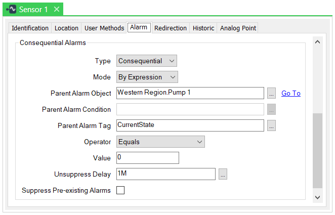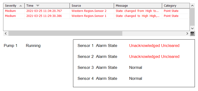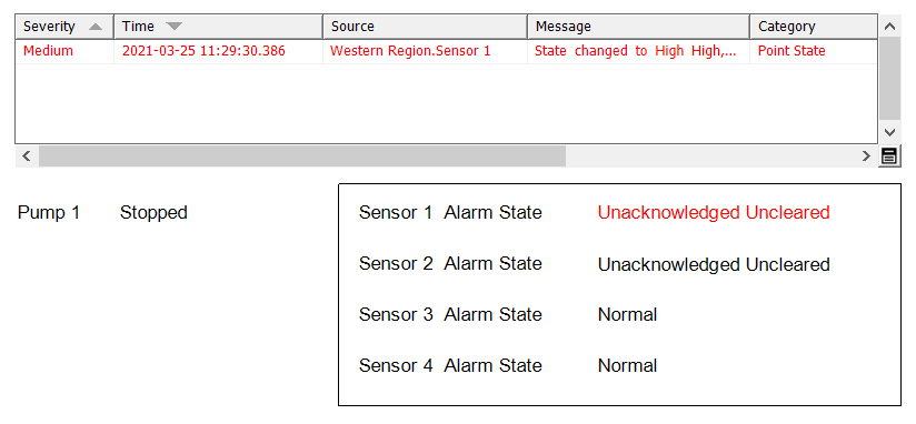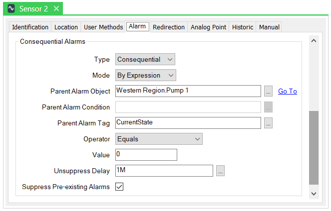 Once the delay expires, if any sensor alarms are still in existence, and 'Pump 1' has remained 'Running' (or any other state that does not trigger suppression on the sensors), the alarms will become unsuppressed. The alarms will therefore no longer be hidden from alarm displays.