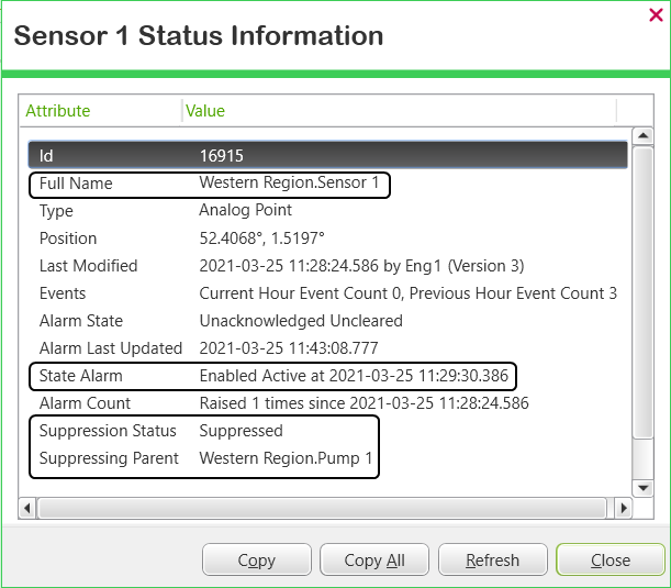 As an alarm existed on 'Sensor 1' when suppression came into force, that existing alarm remains visible on alarm displays, including the embedded Alarms List on the Mimic. Additionally, the status of the State Alarm of 'Sensor 1' remains unsuppressed (as it relates to the alarm that was already in existence when the suppression was triggered.) The suppression status and its lack of impact on the existing alarm can be seen by viewing the Status display for 'Sensor 1':