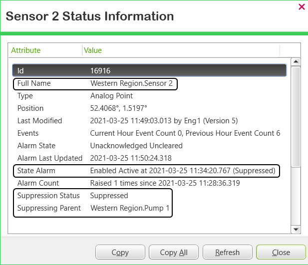 The impact of suppression on the existing alarm on 'Sensor 2' can also be seen by viewing that item's Status display: