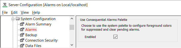 As the sensors appear on Mimics, the Consequential Alarms Palette is enabled so that the sensors' values on those Mimics clearly indicate when the sensors' alarms are suppressed. (When the Consequential Alarms Palette is enabled, suppressed alarms that appear on non-alarm displays such as Mimics are assigned the Alarm Suppressed and Alarm Suppression Clear Pending system colors in place of Alarm Severity colors.) The Consequential Alarms Palette is enabled using the Server Configuration Tool: