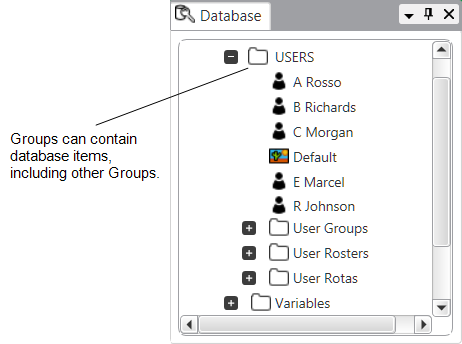 Each Group can contain both database items and other Groups. You can organize your database into a hierarchy of up to 16 levels of Groups and database items; this in addition to the Root Group. This allows you to create complex hierarchies that reflect the design of your system. Typically, you use Groups to organize database items according to their geographical location, their type, or their purpose.