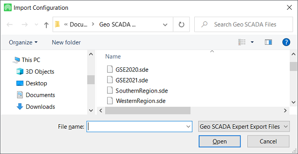 - Use the Import From window to locate the Geo SCADA Expert export (.sde) file that you want to import into your database.