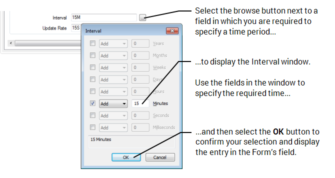 Use the Interval window to Specify a Time Period in the OPC Time Format. The window is displayed when you select the browse button next to a field in which you are required to specify a time period.