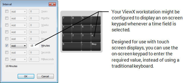If the Interval window is accessed from a ViewX workstation on which the On-Screen Keyboard feature is enabled, a keypad is displayed on-screen whenever you select a time field.