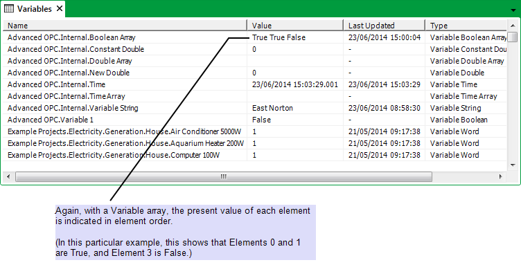 Operators can ascertain the present values of each element by displaying, for example, the Variable’s Status display: