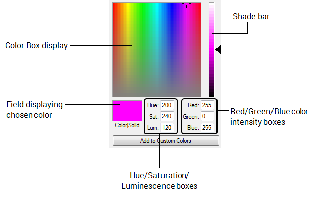 • Define the numeric values of the color in the Hue/Saturation/Luminescence boxes.