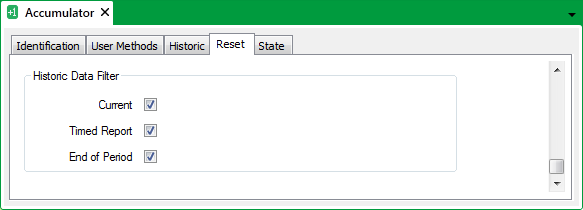 Use the fields within the Historic Data Filter section of the Reset tab to specify the type of Accumulator data that Geo SCADA Expert is to store historically: