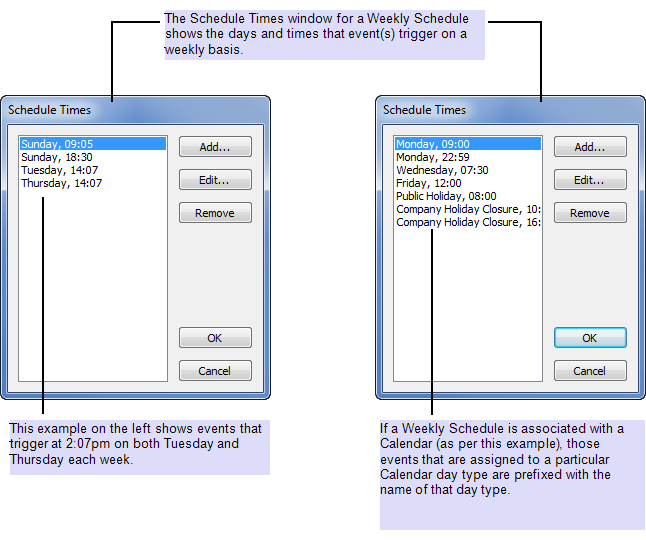 The format in which a schedule’s trigger times are displayed in the Schedule Times window varies, depending on the type of Schedule and whether that Schedule is associated with a Calendar.