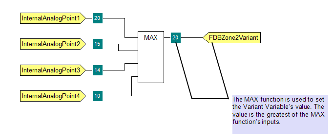 A Variant Variable is used as an output in a Function Block Diagram. Its value is determined by the greatest of several inputs. Both the inputs and the Variant Variable have Unsigned Short Integer (USINT) values.