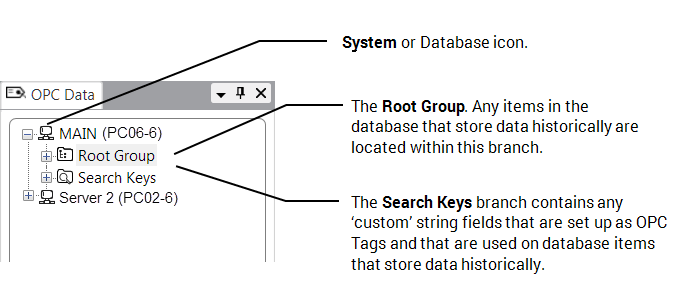 - Search Keys—Use this branch to access the OPC historic properties of any ‘custom’ string fields and the database items on which those fields are located (see Access Historic Search Key Tags).